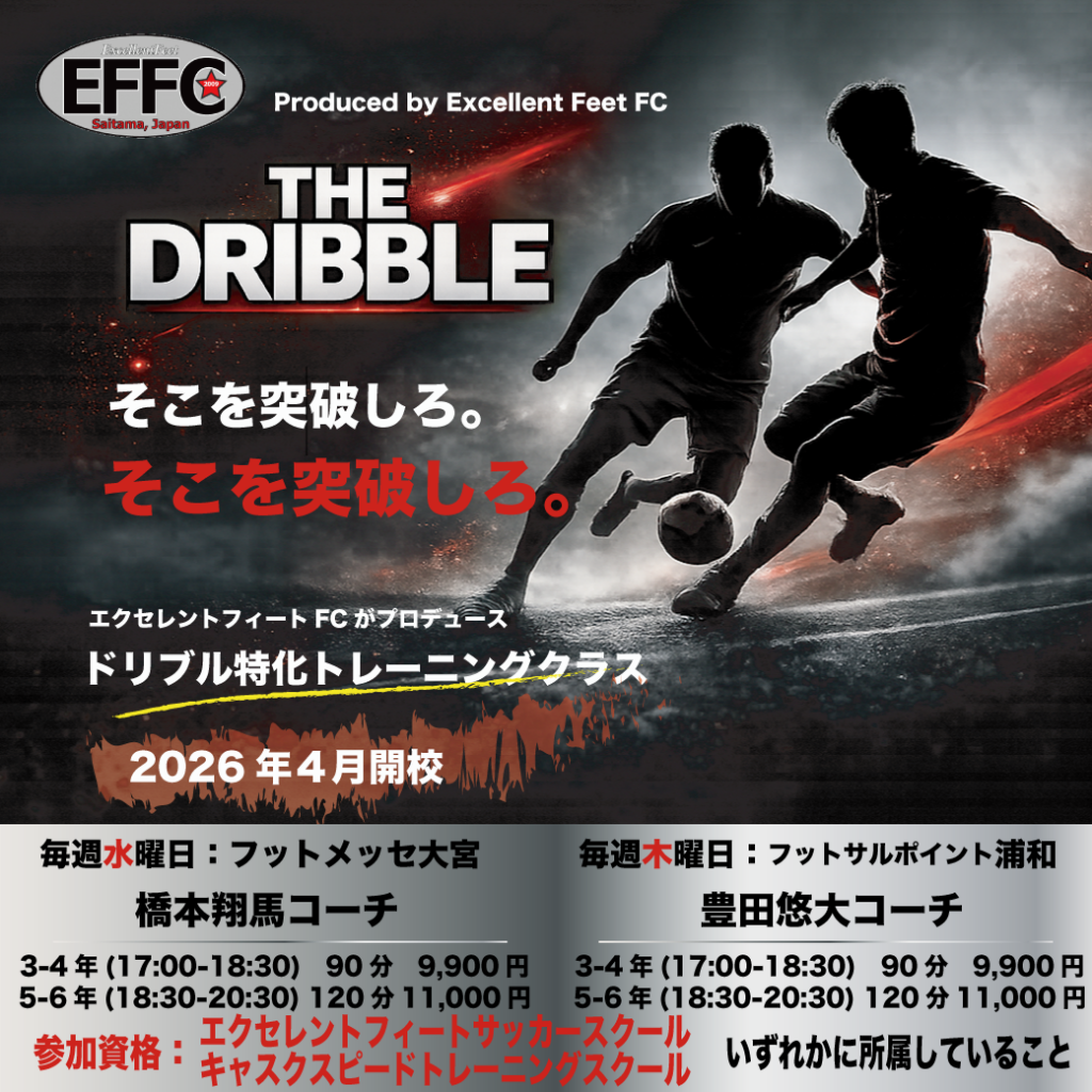 【THE DRIBBLE 始動!!】エクセレントフィートFCがプロデュースする「ドリブル特化クラス」を開校!! ■入会条件・キャスクスピードトレーニングスクールに所属しているこ…